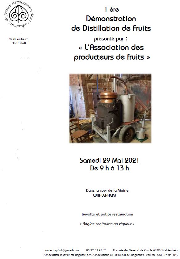 L’association des producteurs de fruits (Wahlenheim Hochstett) va faire une démonstration de distillation de fruits dans la cour de la Mairie, le samedi matin 29 mai 2021 de 9h à 13h.