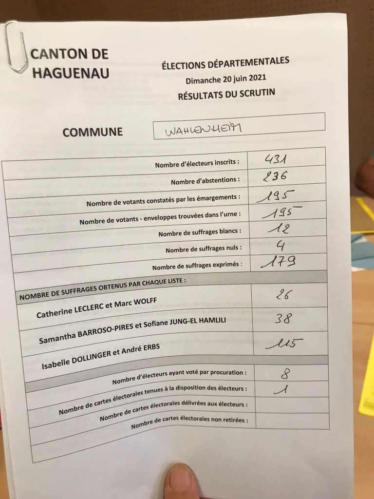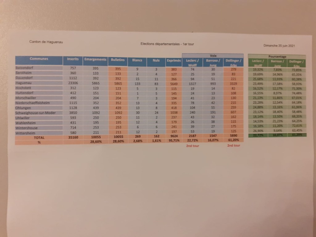 Pour les départementales, un avance du binome DOLLINGER ERBS, mais un second tour est necessaire (50% des voix et 25% des inscrits). Merci à tous les electeurs pour une belle participation à 45% et rdv le 27/6 de 8h à 18h pour le second tour, departementales et regionales.