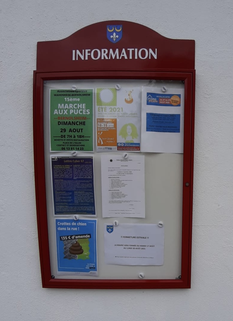 La commune de Wahlenheim s’est dotée de nouveaux panneaux d’affichage ce été, pour compléter et uniformiser la communication des informations à destinations des habitants.