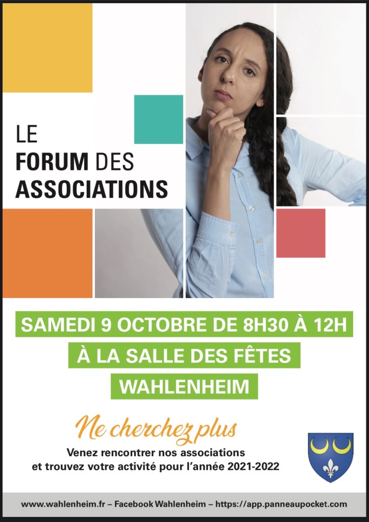 La commune de Wahlenheim organise le forum des associations 2021, le samedi 9 octobre 2021 de 8h30 à 12h, à la salle des fêtes du village.