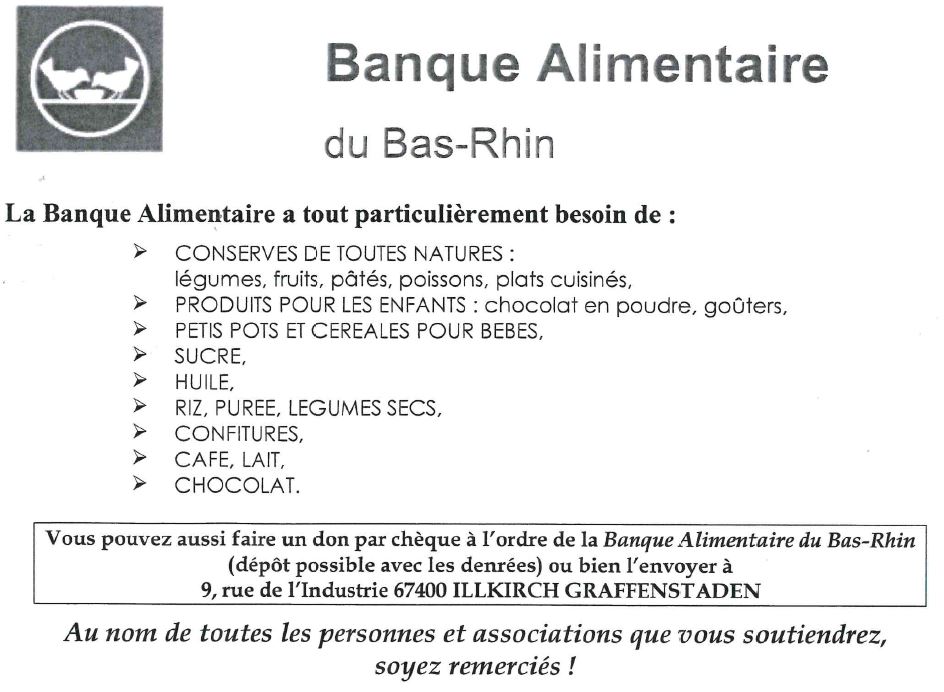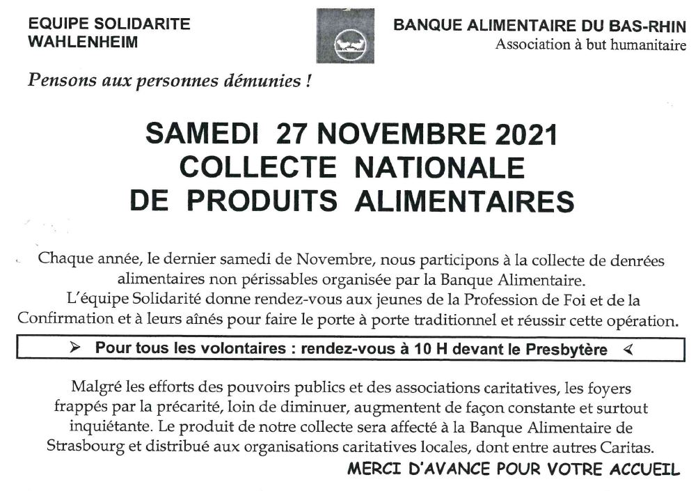 Comme chaque année, l’équipe « Solidarité Wahlenheim » organise une collecte pour la banque alimentaire du Bas-Rhin le samedi 27 novembre 2021