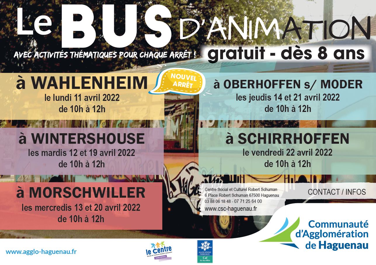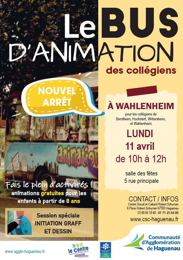 Le bus d’animation revient à Wahlenheim , pour les jeunes dès 8ans. Animation gratuite organisée par la CAH.
