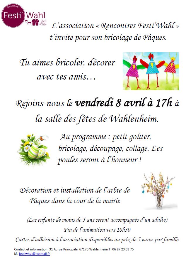 L’association Festi’Wahl organise un bricolage de Pâques le vendredi 8 avril 2022 à 17h à la salle des fêtes de Wahlenheim