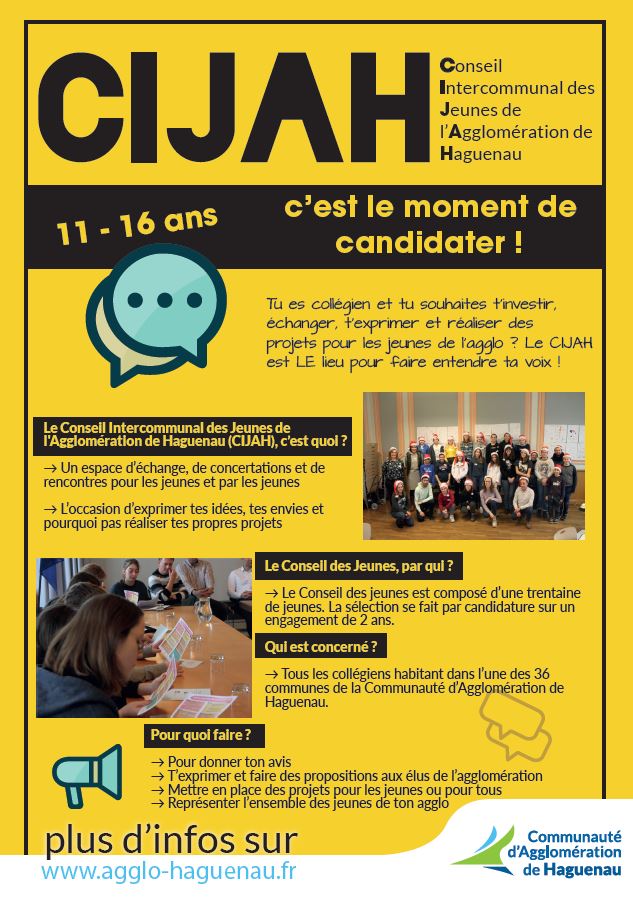 👉collégien , qui souhaite s’investir, échanger, s’exprimer et réaliser des projets pour les jeunes de l’agglo : Le Conseil Intercommunal des Jeunes de l’Agglo de Haguenau (CIJAH) est le lieu pour faire entendre sa voix✌👍.