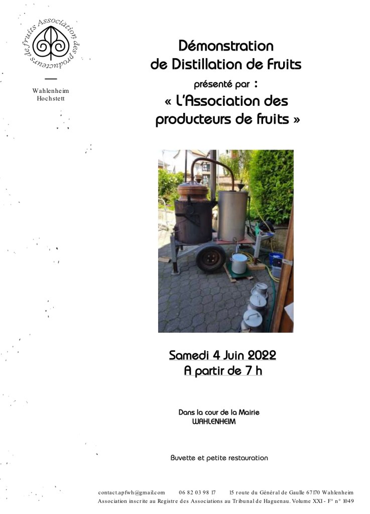 L’Association des producteurs de fruits de WAHLENHEIM HOCHSTETT, organise une nouvelle démonstration de distillation le samedi 4 juin 2022 dans la cours de la mairie.👋