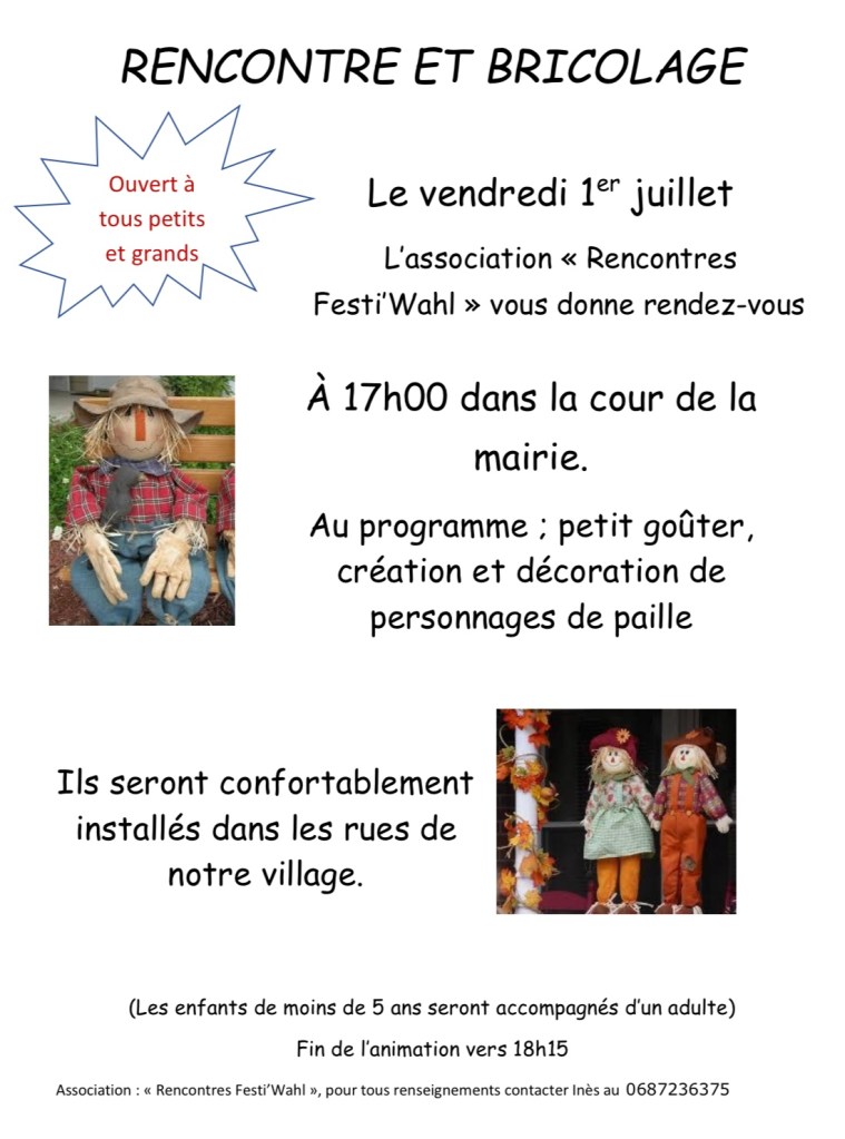 L’association Festi’wahl organise un atelier rencontre et bricolage le 1er juillet 2022 à 17h✅ dans la cour de la mairie