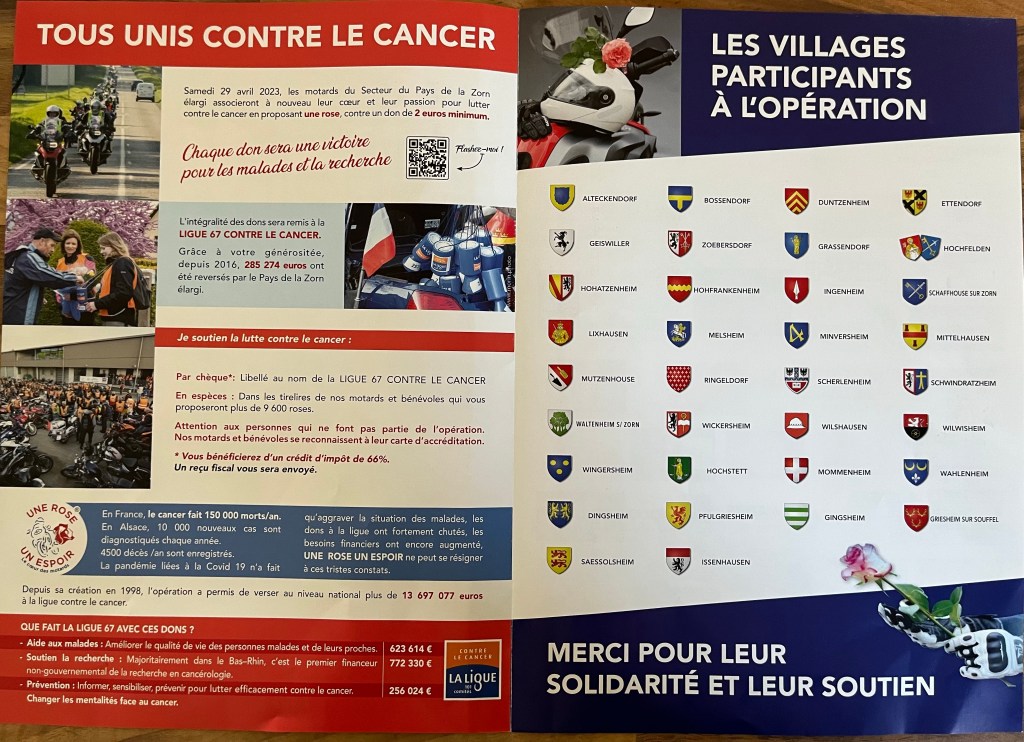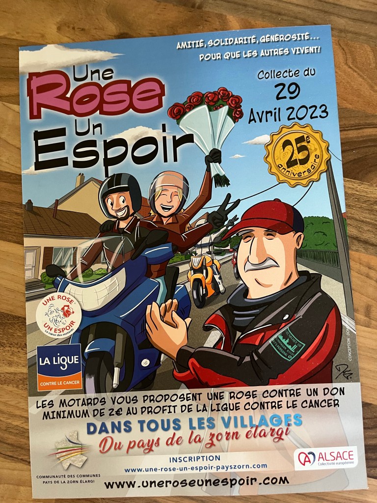 Samedi 29 avril 2023, les motards de WAHLENHEIM et du Secteur du Pays de la Zorn élargi associeront à nouveau leur cœur et leur passion pour lutter contre le cancer en proposant une rose, contre un don de 2 euros minimum.