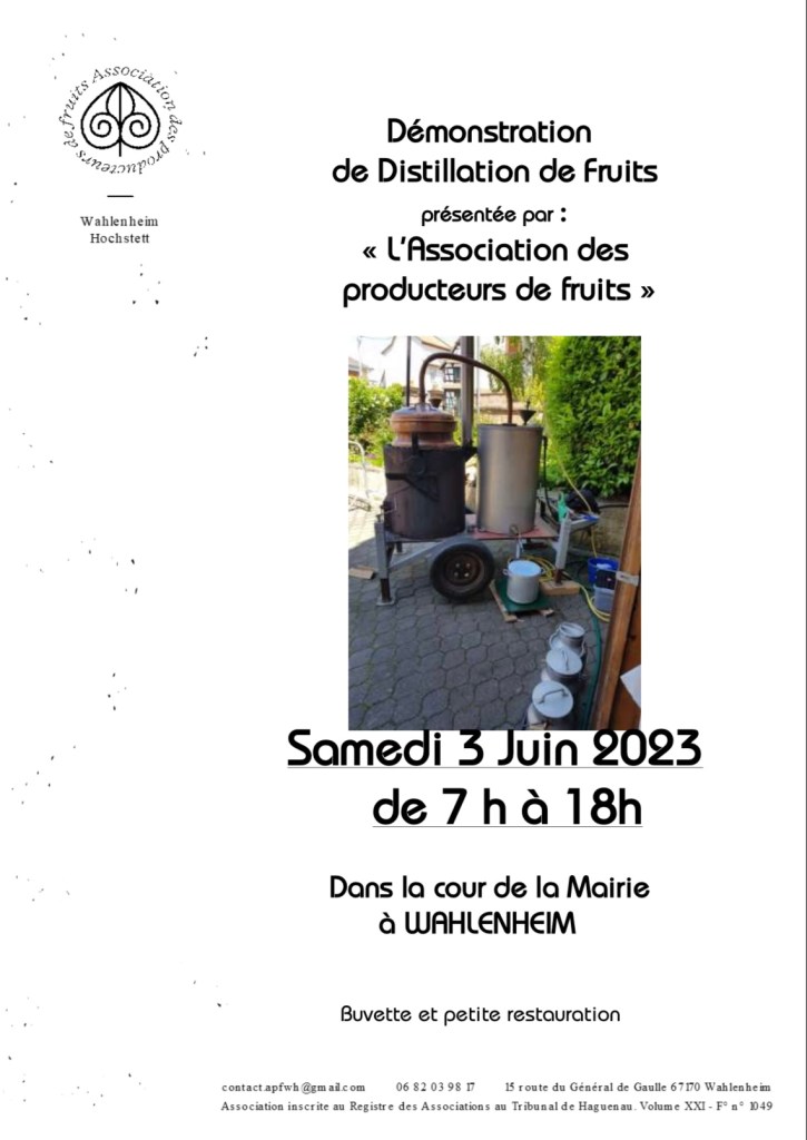 [demonstration de distillation] l’association des Producteurs de fruits de Wahlenheim Hochstett organise une démonstration de distillation le samedi 3 juin 2023 de 7h à 18h dans la cour de la mairie de Wahlenheim.