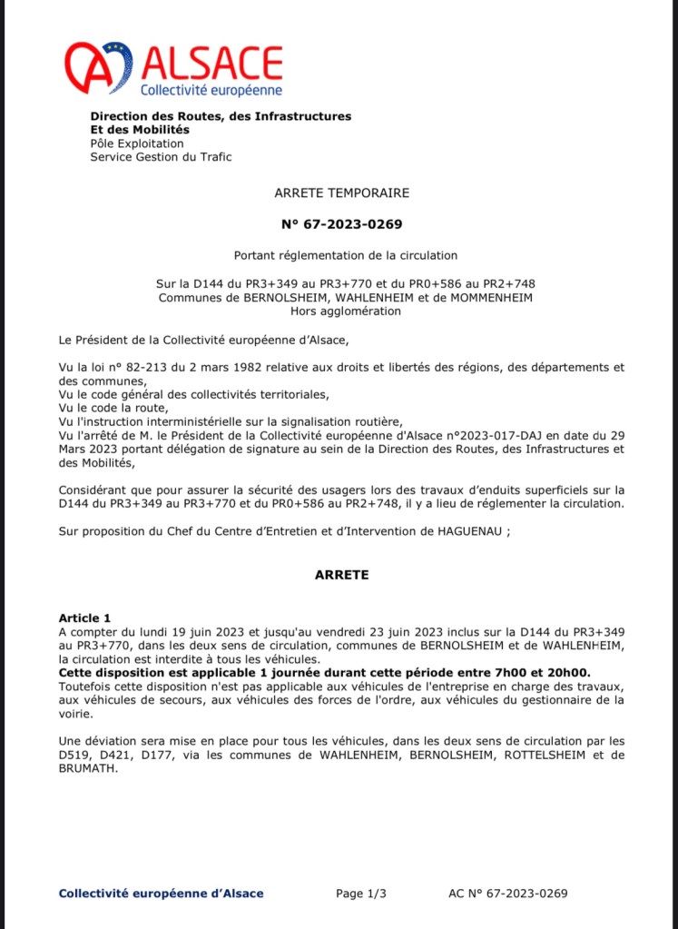 Des travaux routiers sur le route départementale D144 sont prévus du lundi 19 juin au vendredi 23 juin; la circulation sera perturbée, merci respecter la signalisation