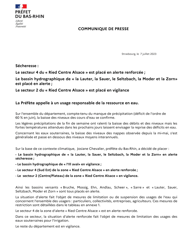 Restrictions d’eau dans le Bas Rhin pour les particuliers et collectivités : message de la préfecture ☀️☝️