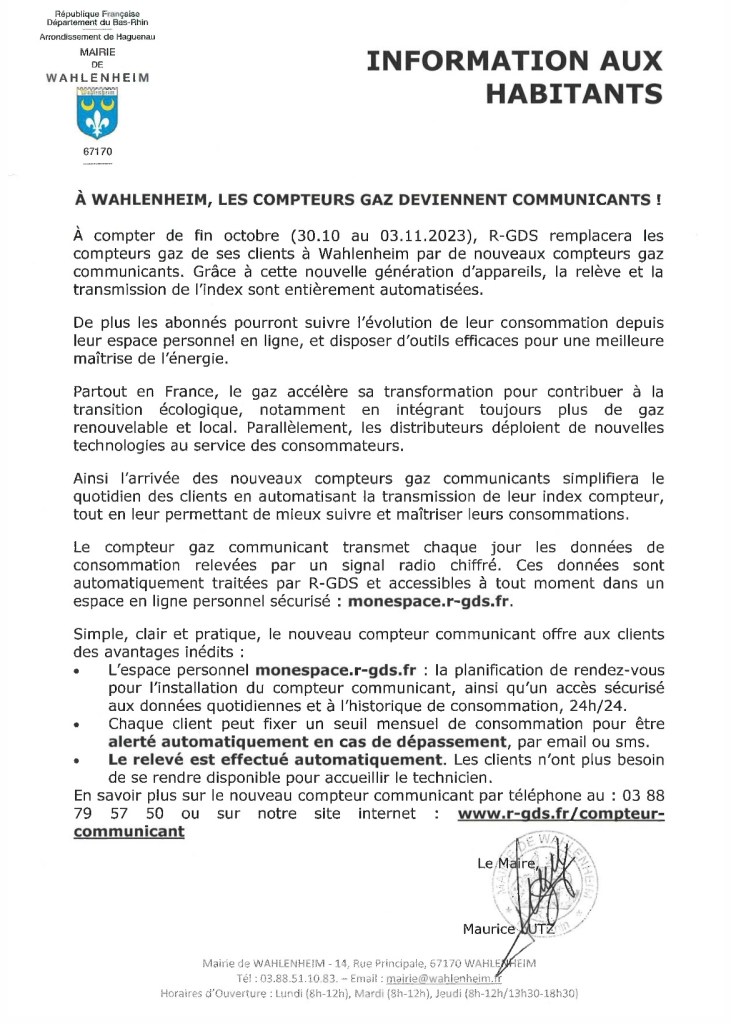 À compter de fin octobre (30.10 au 03.11.2023), R-GDS remplacera les compteurs gaz à Wahlenheim par de nouveaux compteurs gaz communicants. Grâce à cette nouvelle génération d’appareils, la relève et la