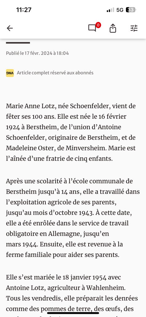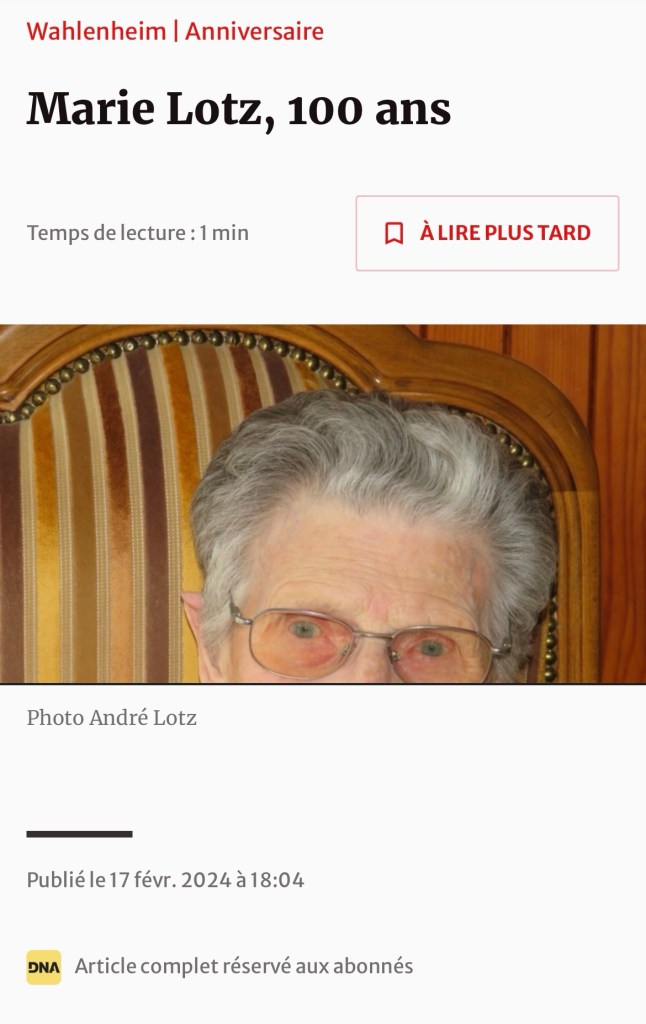 Marie LOTZ 100ans (article DNA)