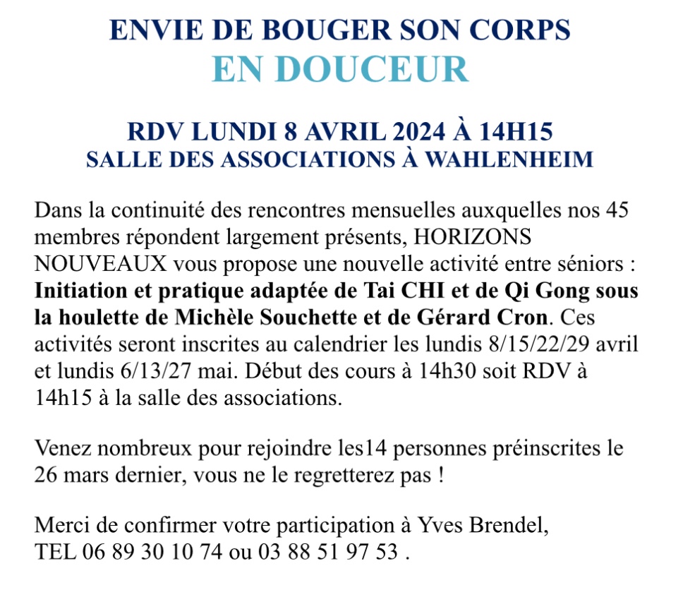 Excellent début de la session d’initiation au Qi Gong Tai Chi où se sont retrouvés 14 personnes dont 4 ont suivi le cours en position assise ! Merci à Michèle et Gérard qui encadrent bénévolement cette activité !