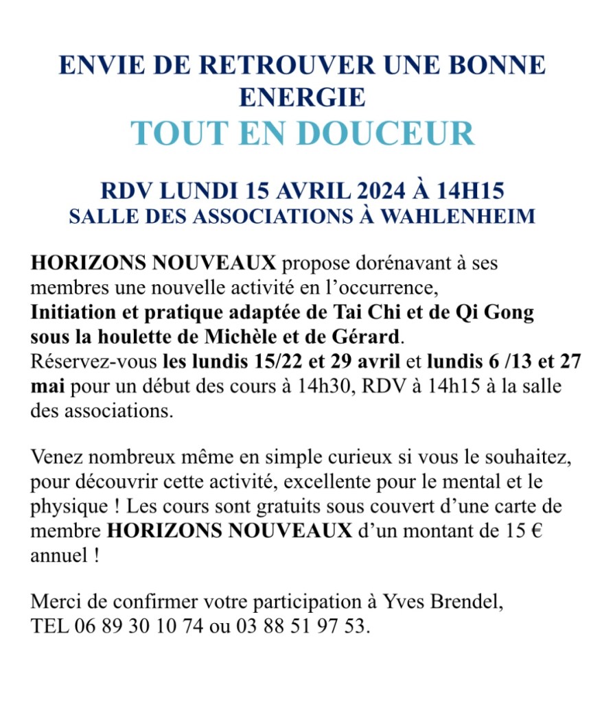 Venez nombreux même en simple curieux si vous le souhaitez, pour découvrir cette activité, excellente pour le mental et le physique ! Les cours sont gratuits sous couvert d’une carte de membre HORIZONS NOUVEAUX d’un montant de 15 € annuel !
