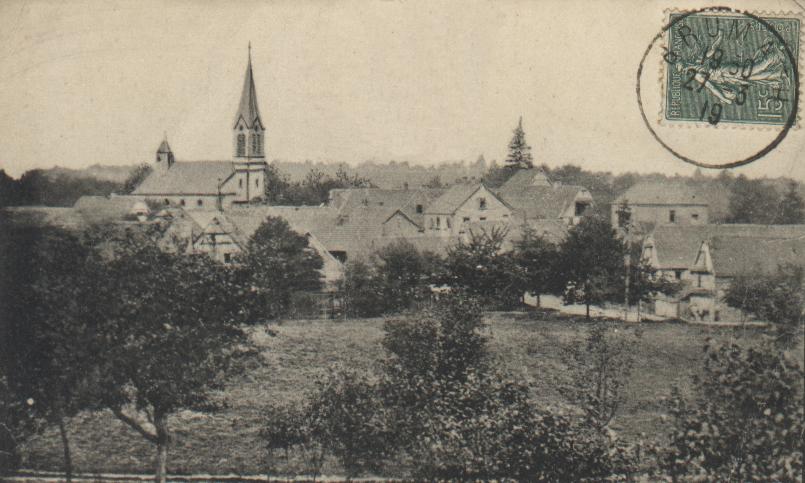 Une carte postale du village (bistrot / école / église) : source J Kehren.